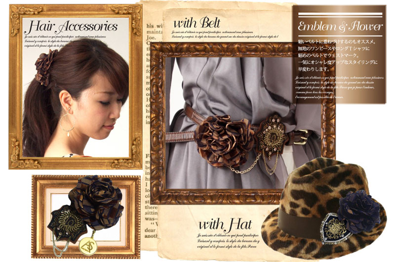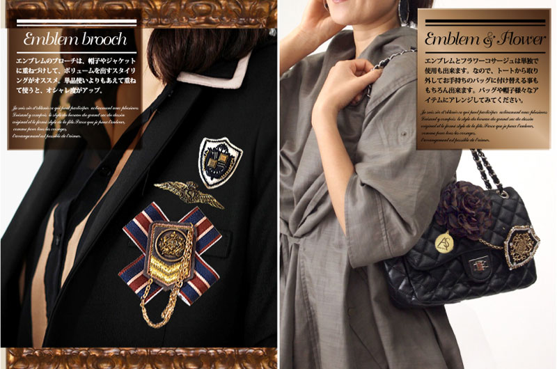 【左・中】エンブレムブローチ付コサージュ ブラウンコサージュ・ビジューブラウンエンブレムCHA-2-E