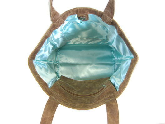 裏地にはエメラルドカラーのサテン風生地を使用、床置きOKの足付きで、オシャレ+実用性にもこだわったバッグです。