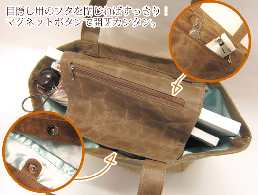 バッグの中身が見えないように、切り替え部分と同じ生地で小物入れ付のフタをつけました。