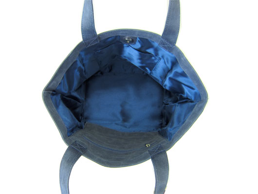 裏地にはネイビーのサテン風生地を使用、床置きOKの足付きで、オシャレ+実用性にもこだわったバッグです。