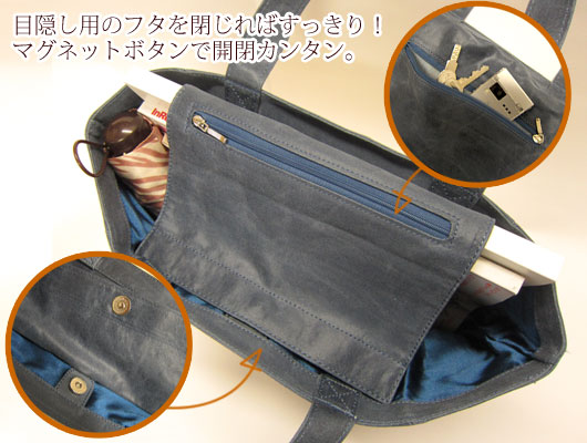 バッグの中身が見えないように、切り替え部分と同じ生地で小物入れ付のフタをつけました。