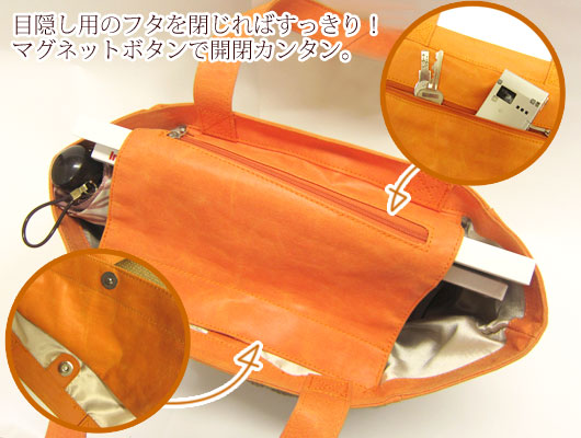 バッグの中身が見えないように、切り替え部分と同じ生地で小物入れ付のフタをつけました。