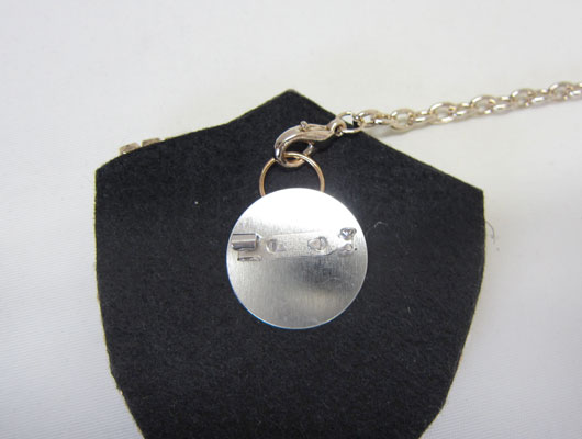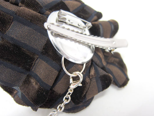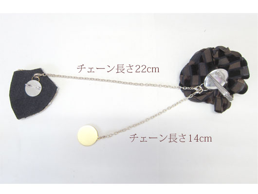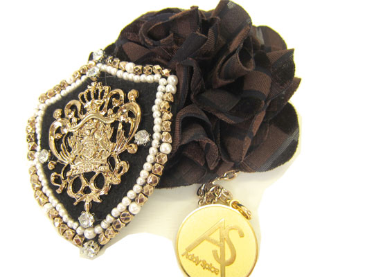 起毛生地を使ったシックなコサージュと、エンブレムブローチ、アディースパイスオリジナルコインのチャームセットです。