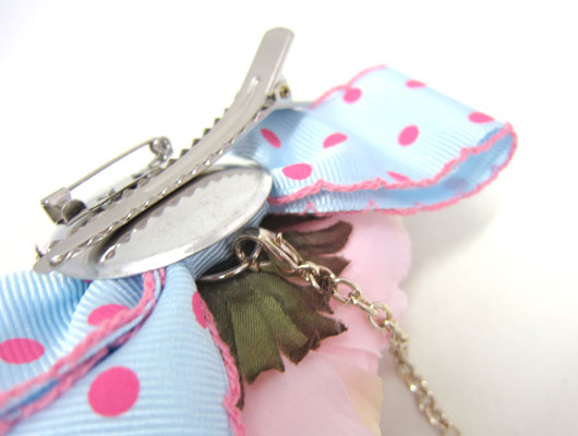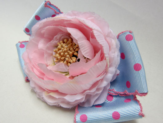 可憐な印象の薄ピンク花×ブルードットリボン。コーデに甘さをプラスして女子度アップ! さみしくなりがちなシンプル服・小物にプラスして華やかに。