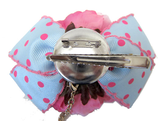 TOP > チャーム>ドットリボン付コサージュ>薄ピンク花×ブルードットリボンCHA-03-E