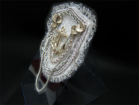 レース地に碇モチーフを組み合わせたエンブレムブローチ。