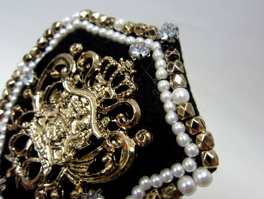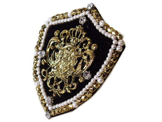 縁にゴールド×パールビーズをぎっしり並べたエンブレムブローチ。 中心部のゴールドモチーフとラインストーンも、ボリューミーでリッチな印象です。